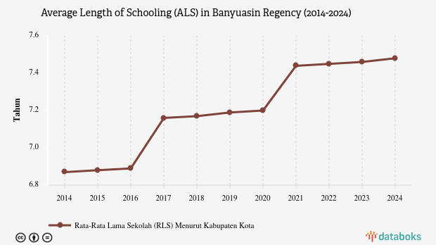 Banyuasin's resident ALS increased by 0.02 years (0.27%) compared to the previous year's 7.46 years. Meanwhile, over the last five years, the ALS has increased by 0.29 years (4.03%).