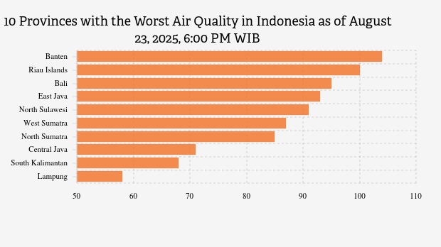 Here is a list of the 10 provinces with the worst air quality index in Indonesia on Saturday, August 23, 2025, at 6:00 PM WIB.