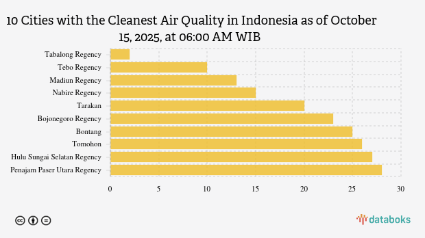 Tabalong Regency's air quality this morning is the cleanest in Indonesia. Based on the air quality index by the Ministry of Environment and Forestry (KLHK), Tabalong Regency scored 2 on Wednesday (15/10/2025) at 06:00 AM WIB.