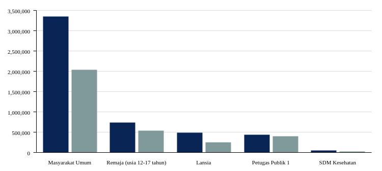 For public sector workers, the target was 409,850 individuals. The first dose vaccination reached 438,470 individuals (106.98% of the target), and the second dose reached 403,850 individuals (98.54% of the target).