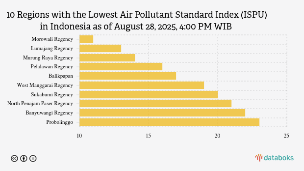 At that time, Morowali Regency''s air quality was classified as good, meaning the pollutant levels in Morowali Regency''s air were very minimal. Furthermore, Lumajang Regency took second place with an air quality index of 13. Next, Murung Raya Regency was in third place with an air quality index of 14.