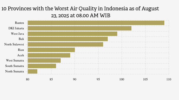 Here is the list of the 10 provinces with the worst air quality index in Indonesia on Saturday, August 23, 2025, at 08.00 AM WIB.