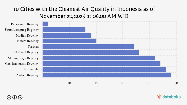 Here is a list of the 10 cities with the cleanest air quality in Indonesia according to KLHK on Saturday, November 22, 2025, at 06.00 AM WIB.