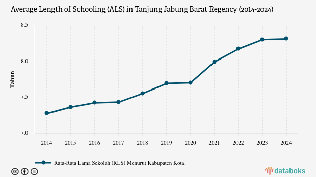 The average length of schooling (ALS) for the population aged 25 and over in Tanjung Jabung Barat, Jambi, was 8.32 years in 2024.