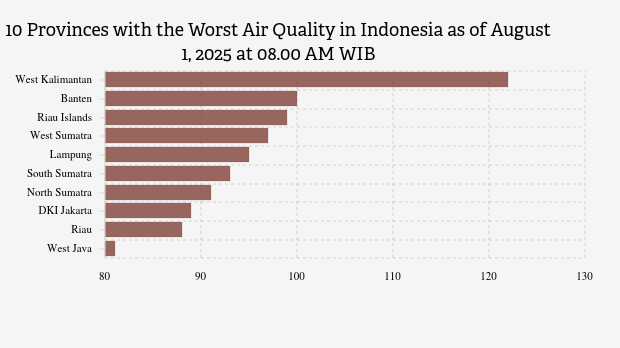 Here is a list of the 10 provinces with the worst air quality index in Indonesia on Friday, August 1, 2025, at 08.00 AM WIB.