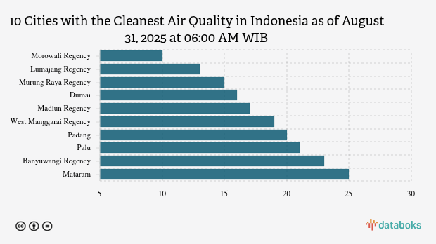 Here is the complete list of the 10 cities with the cleanest air quality in Indonesia according to KLHK on Sunday, August 31, 2025, at 06:00 AM WIB.