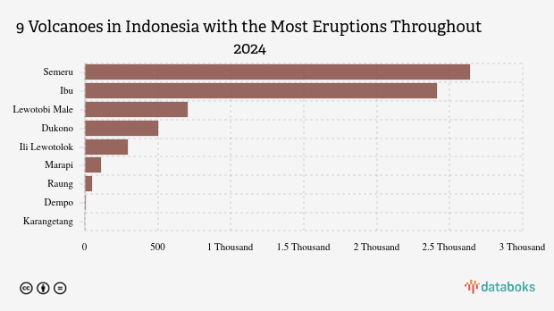 Throughout 2025, MAGMA Indonesia has recorded 6,708 volcano eruptions across Indonesia. Mount Semeru in East Java has erupted the most with 2,638 eruptions.