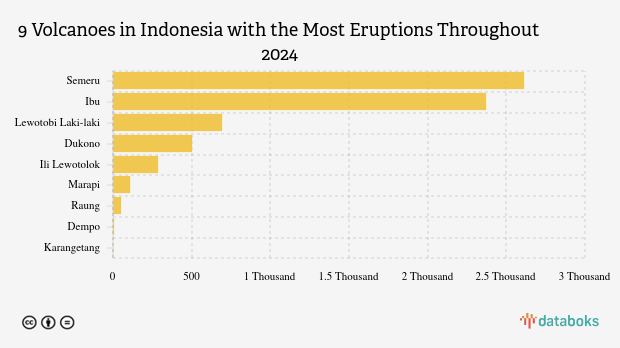 Throughout 2025, MAGMA Indonesia has recorded 6,632 volcanic eruptions across Indonesia. Mount Semeru in East Java had the most eruptions (2,613 times), while Mount Ibu erupted 2,372 times.