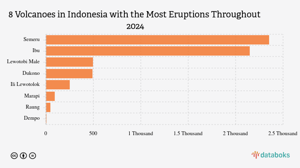 Throughout 2025, MAGMA Indonesia has recorded 5,872 volcanic eruptions across Indonesia. Mount Semeru in East Java had the most eruptions (2,351 times) while Mount Ibu erupted 2,146 times.