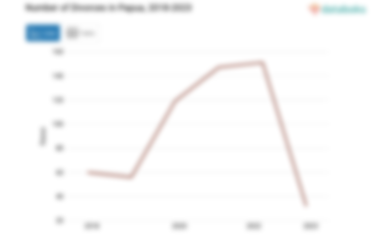 The number of divorces in Papua in 2023 was recorded at 32 cases. This figure is lower than in 2022 and lower than in December 2021. The growth over the last five years in this region shows a decrease of -10.59%.