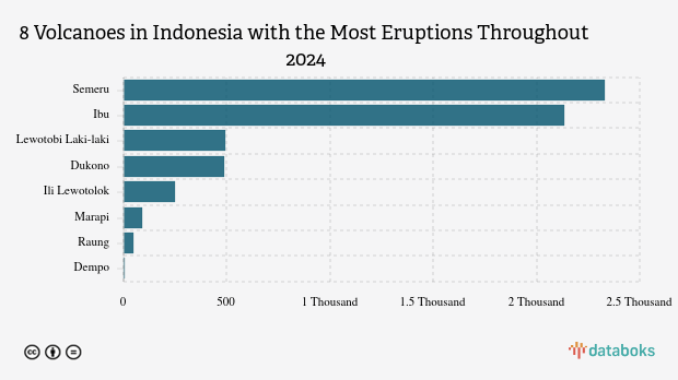 Throughout 2025, MAGMA Indonesia has recorded 5,836 volcanic eruptions across Indonesia. Mount Semeru in East Java had the most eruptions (2,333 times), while Mount Ili Lewotolok erupted 249 times.
