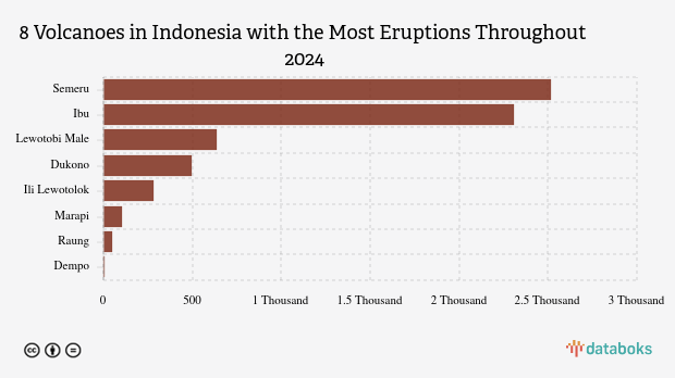 Throughout 2025, MAGMA Indonesia has recorded 6,399 volcanic eruptions across Indonesia. Mount Semeru in East Java had the most eruptions (2,515 times), while Mount Ibu erupted 2,309 times.
