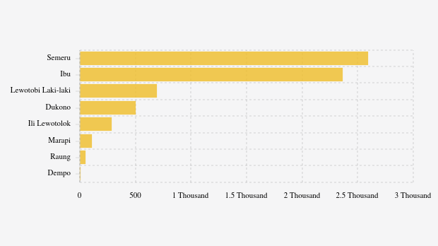 Throughout 2025, MAGMA Indonesia has recorded 6,594 volcanic eruptions across Indonesia. Mount Semeru in East Java has erupted the most, with 2,592 occurrences.