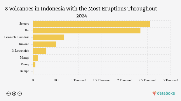 Throughout 2025, MAGMA Indonesia has recorded 6,494 volcanic eruptions across Indonesia. Mount Semeru in East Java had the most eruptions (2,542 times) while Mount Ibu erupted 2,339 times.