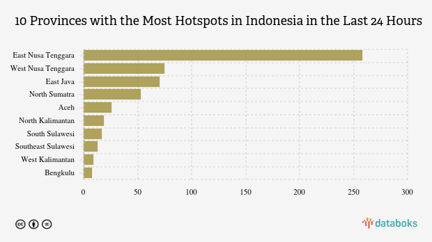The most detected hotspots were in East Nusa Tenggara, with 258 points. West Nusa Tenggara ranked second with 75 hotspots. East Java was in third place with 70 hotspots.