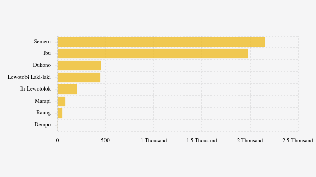 Throughout 2025, MAGMA Indonesia has recorded 5,354 volcanic eruptions across Indonesia. Mount Semeru in East Java had the most eruptions (2,151 times), while Mount Dukono erupted 451 times.