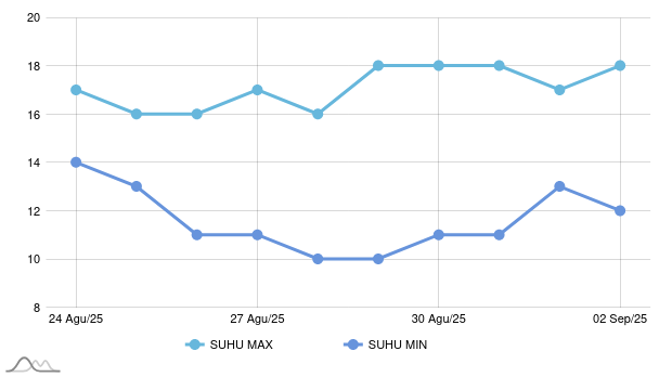 The Meteorology, Climatology, and Geophysics Agency (BMKG) reports that the weather in Dogiyai today is cloudy. Over the next week, there is a possibility of light rain on two occasions: Friday, May 16, 2025, and Saturday, May 17, 2025. Additionally, Friday, May 16, 2025 will have light rain and Saturday, May 10, 2025 will be cloudy. According to BMKG, thunderstorms are not expected in the next week.