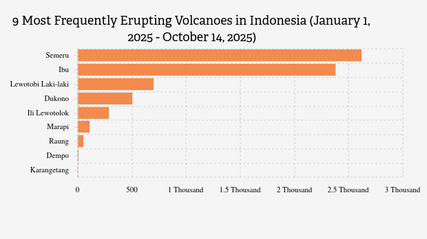 Throughout 2025, MAGMA Indonesia has recorded 6,644 volcanic eruptions across Indonesia. Mount Semeru in East Java had the most eruptions (2,617 times) while Mount Marapi erupted 111 times.