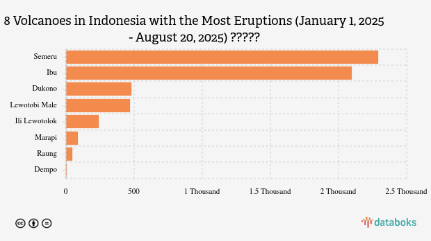 Throughout 2025, MAGMA Indonesia has recorded 5,712 volcanic eruptions across Indonesia. Mount Semeru in East Java had the most eruptions, with 2,292 occurrences.