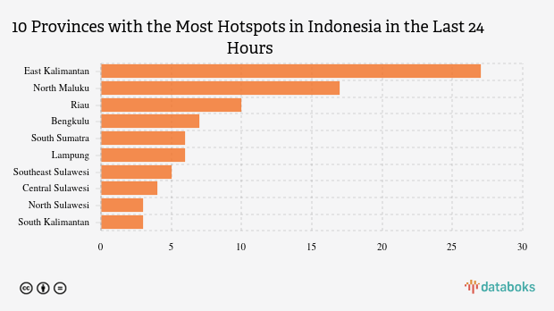The most detected hotspots were in East Kalimantan with 27 points. North Maluku was in second place with the most hotspots with 17 points. Riau was in third place with 10 hotspots.