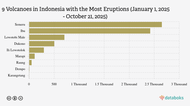 Throughout 2025, MAGMA Indonesia has recorded 6,733 volcano eruptions across Indonesia. Mount Semeru in East Java had the most eruptions (2,654 times), while Mount Ibu erupted 2,420 times.