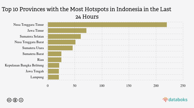 The most detected hotspots, totaling 220 points, are in East Nusa Tenggara. East Java ranks second with 71 hotspots. South Sumatra is in third position with 61 hotspots.