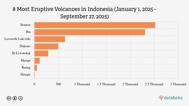 Throughout 2025, MAGMA Indonesia has recorded 6,397 volcanic eruptions across Indonesia. Mount Semeru in East Java had the most eruptions (2,514 times), while Mount Ibu erupted 2,308 times.