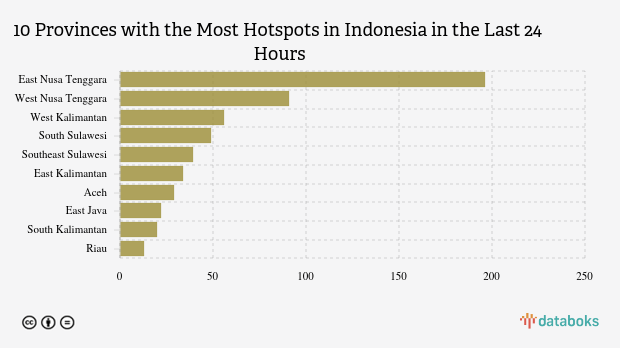 Most detected hotspots were in East Nusa Tenggara with 196 points. West Nusa Tenggara ranked second with 91 hotspots. West Kalimantan was in third place with 56 hotspots.