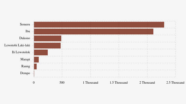 Throughout 2025, MAGMA Indonesia has recorded 5,747 volcanic eruptions across Indonesia. Mount Semeru in East Java had the most eruptions (2,301 times), while Mount Dukono erupted 484 times.