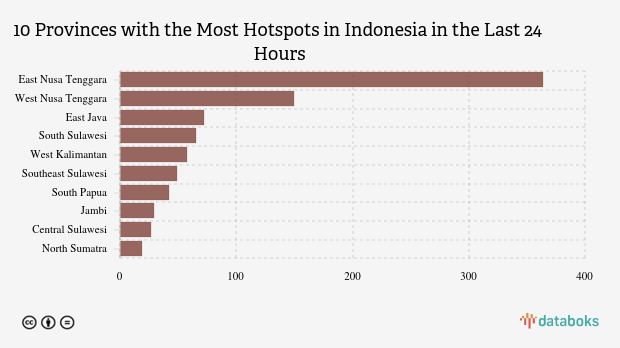 The most detected hotspots were in East Nusa Tenggara with 364 points. West Nusa Tenggara ranked second with 150 hotspots. East Java was in third position with 72 hotspots.