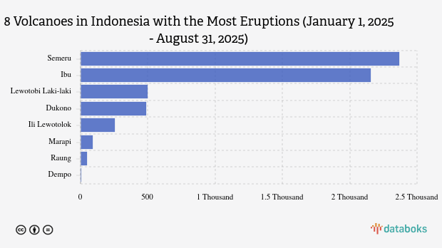 Throughout 2025, MAGMA Indonesia has recorded 5,903 volcanic eruptions across Indonesia. Mount Semeru in East Java had the most eruptions, with 2,365 events.