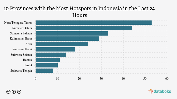 Most detected hotspots were in East Nusa Tenggara with 53 points. North Sumatra ranked second with 44 hotspots. South Sumatra was in third place with 33 hotspots.