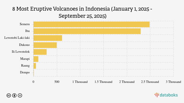 Throughout 2025, MAGMA Indonesia has recorded 6,323 volcanic eruptions across Indonesia. Mount Semeru in East Java had the most eruptions, with 2,486 occurrences.