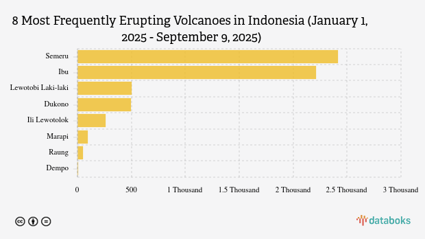 Throughout 2025, MAGMA Indonesia has recorded 6,033 volcanic eruptions across Indonesia. Mount Semeru in East Java had the most eruptions (2,418 times), while Mount Ibu erupted 2,214 times.