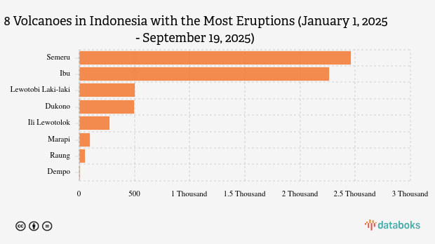 Throughout 2025, MAGMA Indonesia has recorded 6,146 volcanic eruptions across Indonesia. Mount Semeru in East Java had the most eruptions (2,462 times), while Mount Ili Lewotolok erupted 276 times.