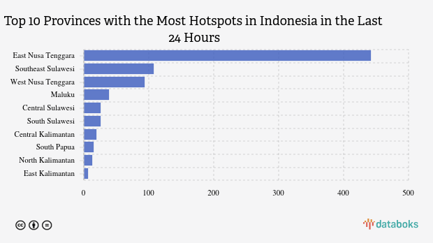 The most detected hotspots were in East Nusa Tenggara with 442 points. Southeast Sulawesi ranked second with the most hotspots, with 107 points. West Nusa Tenggara was in third place with 94 hotspots.