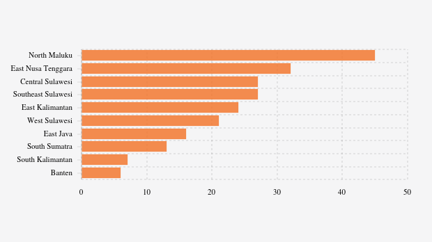A total of 27 hotspots were detected in Southeast Sulawesi, followed by East Kalimantan with 24 hotspots, and West Sulawesi and East Java with 21 and 16 detected hotspots, respectively.