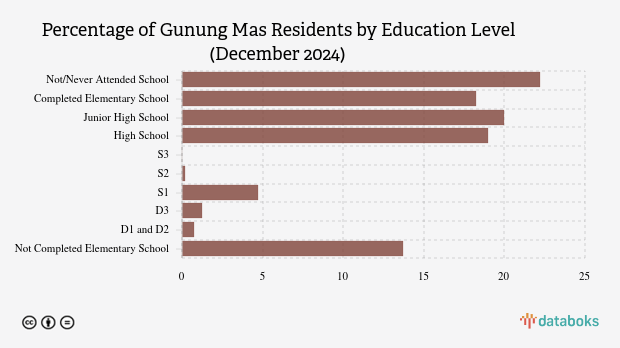 Meanwhile, 13.71% of the population of Gunung Mas Regency had not completed elementary school. As for the population who were not/had not attended school, they accounted for 22.19%.