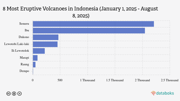 Throughout 2025, MAGMA Indonesia has recorded 5,520 volcanic eruptions/explosions across Indonesia. Mount Semeru in East Java had the most eruptions (2,207 times), while Mount Ibu erupted 2,043 times.