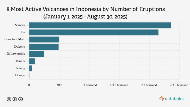 Throughout 2025, MAGMA Indonesia has recorded 5,893 volcano eruptions across Indonesia. Mount Semeru in East Java had the most eruptions, with 2,359 times.