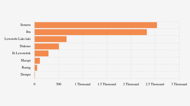 Throughout 2025, MAGMA Indonesia has recorded 6,464 volcanic eruptions across Indonesia. Mount Semeru in East Java had the most eruptions (2,535 times), while Mount Marapi erupted 107 times.