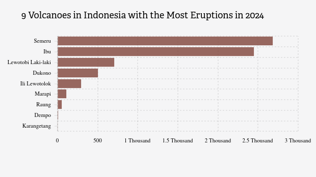 Throughout 2025, MAGMA Indonesia has recorded 6,789 volcanic eruptions across Indonesia. Mount Semeru in East Java has erupted the most, with 2,684 eruptions.