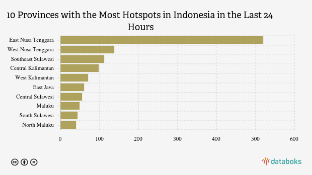 The most detected hotspots are in East Nusa Tenggara with 520 points. West Nusa Tenggara is in second place with 138 hotspots. Southeast Sulawesi is in third place with 112 hotspots.