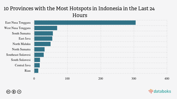 The most detected hotspots were in East Nusa Tenggara with 305 points. West Nusa Tenggara ranked second with 69 hotspots. South Sumatra was in the third position with 56 hotspots.
