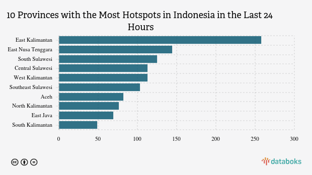 The most detected hotspots are in East Kalimantan with 258 points. East Nusa Tenggara ranks second with 144 hotspots. South Sulawesi is in third position with 125 hotspots.