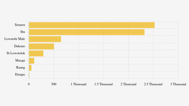 Throughout 2025, MAGMA Indonesia has recorded 6,425 volcanic eruptions across Indonesia. Mount Semeru in East Java had the most eruptions (2,522 times) while Mount Ibu erupted 2,318 times.