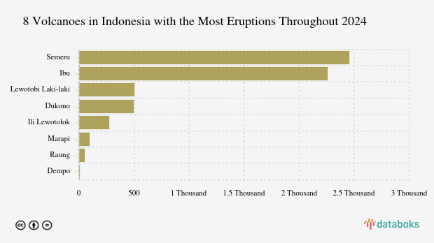 Throughout 2025, MAGMA Indonesia has recorded 6,131 volcanic eruptions across Indonesia. Mount Semeru in East Java had the most eruptions (2,456 times), while Mount Ibu erupted 2,254 times.