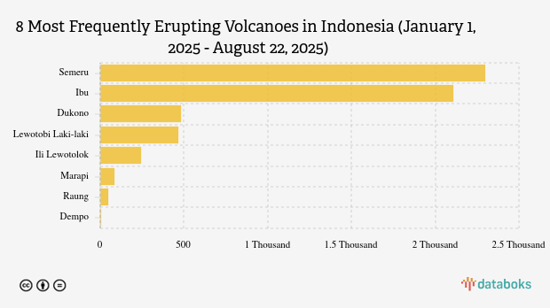 Throughout 2025, MAGMA Indonesia has recorded 5,739 volcanic eruptions across Indonesia. Mount Semeru in East Java erupted the most (2,300 times), while Mount Lewotobi Laki-laki erupted 468 times.