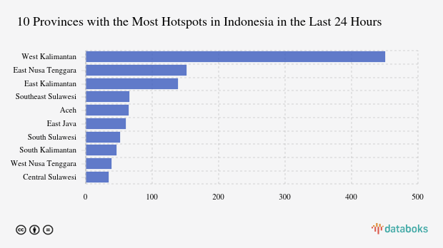 The most detected hotspots are in West Kalimantan with 451 points. East Nusa Tenggara ranks second with the most hotspots, with 152 points. East Kalimantan is in third position with 139 hotspots.