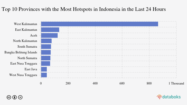 The most detected hotspots are in West Kalimantan with 865 points. East Kalimantan ranks second with 134 hotspots. Aceh is in third place with 122 hotspots.